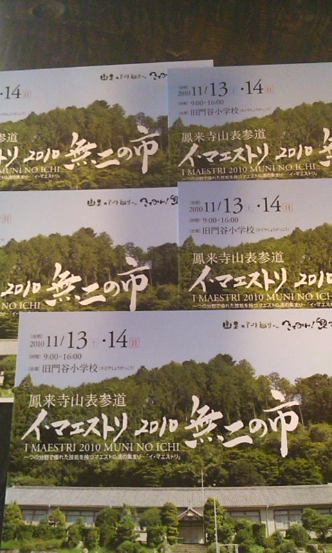 会場:旧門谷小学校 (かどやしょうがっこう) 時間:9:00~16:00 雨天決行 忘れていた“遊びの心”を呼び覚ますきっかけ イ・マエストリ 2010「無二の市」 イ・マエストリ(IMAESTRI)は、イタリア語で、師匠、親 方、先生などひとつの分野で、優れた機能を持つ集まりを 意味しています。 ●造形作家50ブース出展 校庭にて各作家作品展示・販売 ●ワークショップ開催 ●地域の食材を生かしたユニークな 食育カフェ ●音楽ライブ 開演12:00~ ふれでぃー山崎と その仲間たち |